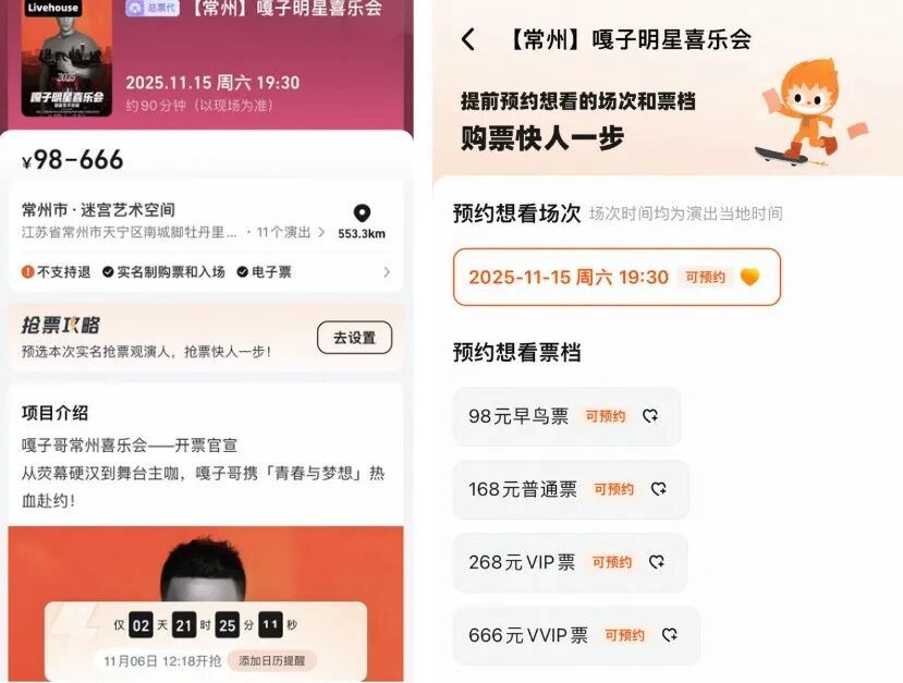 经搜索发现,在买票平台上,常州嘎子明星喜乐会在11月15日举行,票价有98元,168元,268元和666元四个档位,268元可以获得1V5合影,666元可以获得1V1祝福视频,观众规模限定900人。